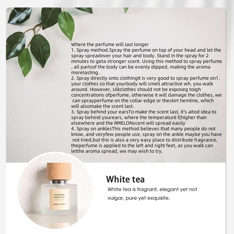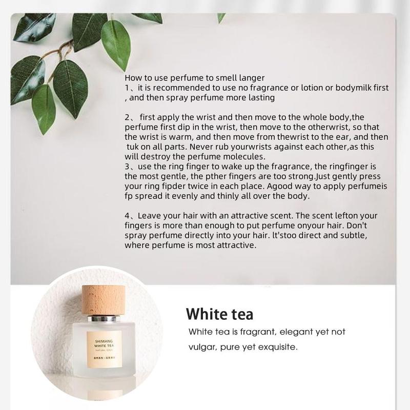 【White Tea Essence】: Infused with the delicate scent of White Tea, this perfume provides a soothing, light fragrance ideal for daily wear.