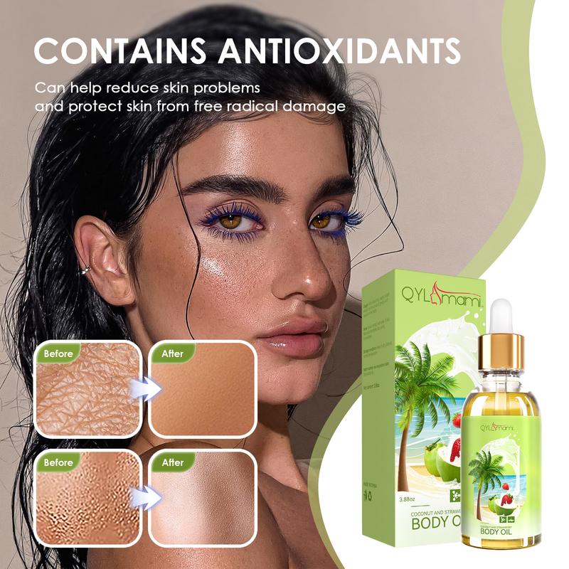 Product efficacy: Coconut scented strawberry body oil can deeply nourish the skin, improve its water retention ability, reduce skin problems, brighten skin tone, and make the skin soft and smooth. Meanwhile, its unique aroma can bring a pleasant sensory experience, allowing you to feel relaxed and joyful every moment of use.