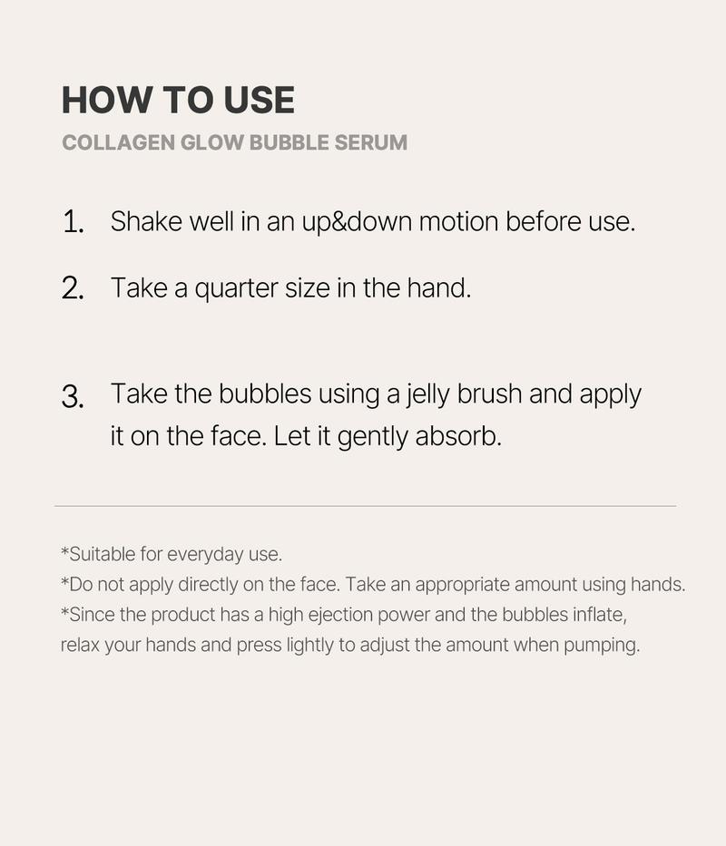 * Due to shipping restrictions regarding pressurized gas containers, ‘Collagen Glow Bubble Serum’ can only be shipped to the continental US. All noncontiguous areas(Hawaii, Alaska, Virgin Islands, Puerto Rico, Guam) and countries outside of the US are not subject to delivery. We are sorry for the inconvenience.